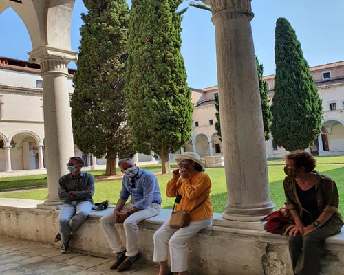 We explore the island of San Giorgio and the gardens of the Fondazione Cini, including the cloister designed by Palladio and the Vatican Chapels installed for the Biennale of 2018. We ascend the bell tower of the church for possibly the best aerial view of the city and the lagoon. For our farewell dinner we are treated to drinks and dinner in a private palazzo.